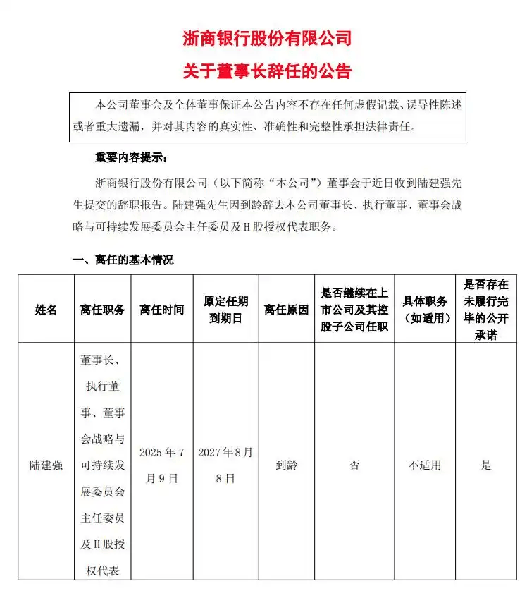 昨日晚间,浙商银行公告陆建强董事长辞任。陆建强董事长出生于1965年4月,已经年满60周岁,辞任在意料之中。
